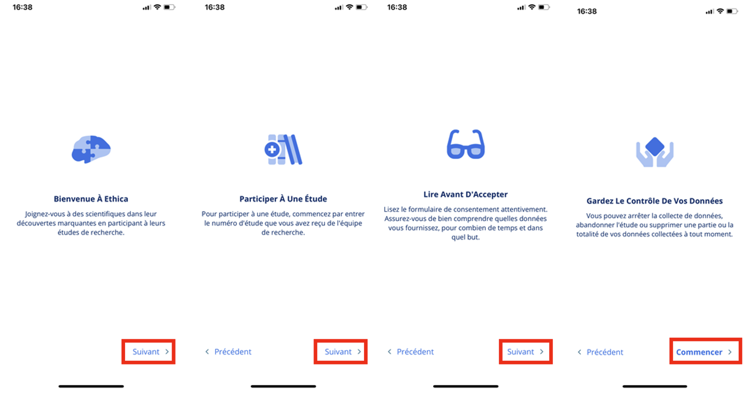 Parcours les pages d’introduction en appuyant trois fois sur “Suivant” et appuie sur “Commencer” pour commencer à participer à l'étude.