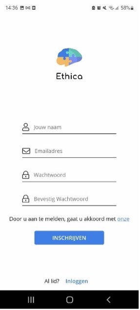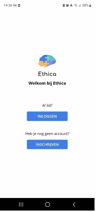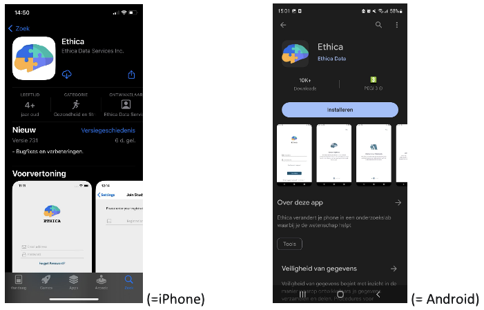 Via deze app zal je de dagelijkse korte vragenlijsten ontvangen. Ga naar de Google Play Store (Android) of de App Store (iPhone) en installeer/download de Ethica applicatie:
