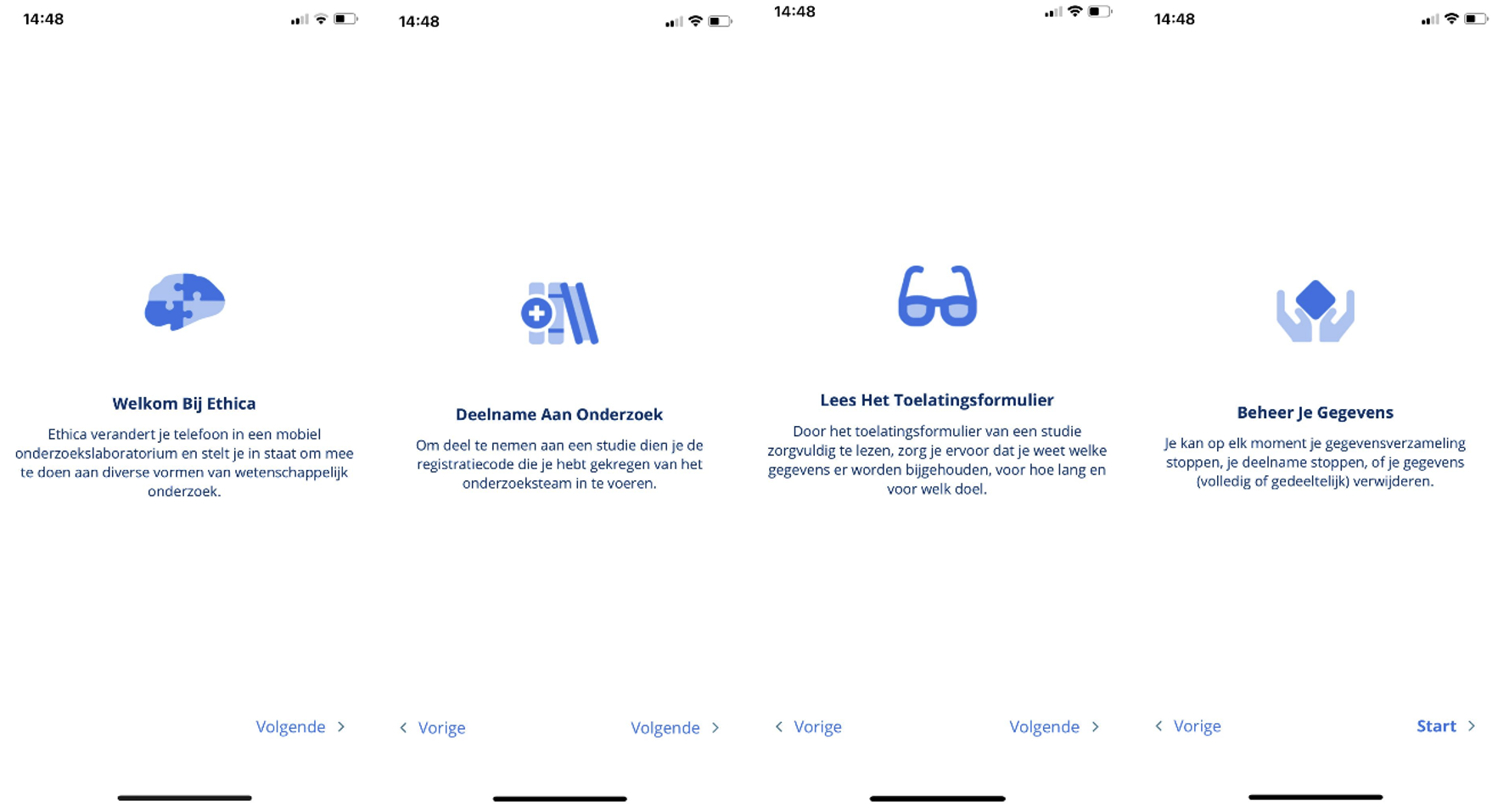 Ga door de introductiepagina’s door telkens (drie keer) op ‘volgende’ te drukken. Druk op ‘Start’ om je deelname aan de studie te beginnen.