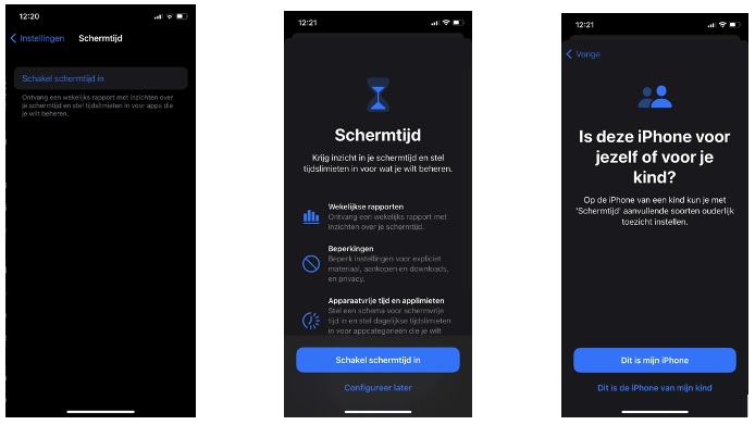 Als je het volgende scherm krijgt, druk dan op “Schakel schermtijd in” en vervolgens “Dit is mijn iPhone”.