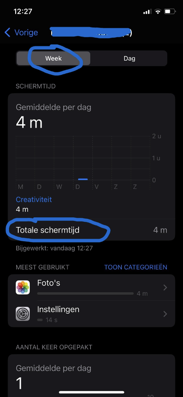 Druk linksboven op “Week” en vul in de vragenlijst het aantal uren en minuten die bij “Totale schermtijd” getoond worden in de applicatie.