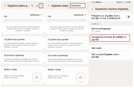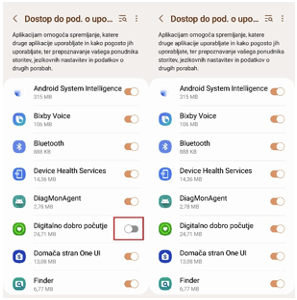 - Izberi “Digitalno dobro počutje” in aktiviraj dostop do podatkov o uporabi za to aplikacijo.