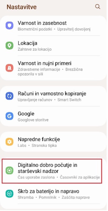 - Podrsaj navzdol in izberi “Digitalno dobro počutje in starševski nadzor”.