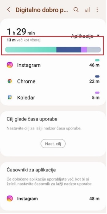Odpre se prikaz uporabe telefona v današnjem dnevu. Nato tapni na “grafikon” s podatki o uporabi telefona.
