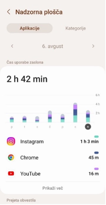 Prikažejo se podatki uporabe telefona v zadnjem tednu. V polja spodaj vpiši število ur in minut uporabe od ponedeljka do nedelje tega tedna. Ti podatki se pokažejo z dotikom na stolpec.